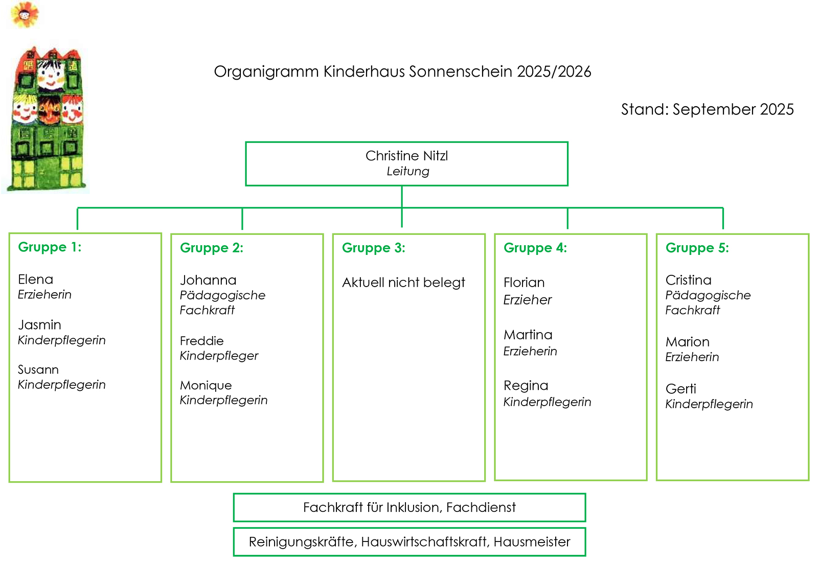 Das Foto zeigt den Kindergarten Haus Sonnenschein von der Georg-Brenninger-Straße aus. Man sieht das erweiterte Gebäude, das einen mittelgrünen Anstrich mit weißen Lisenen hat. Außerdem sieht man einen Teil des Außenspielbereichs.